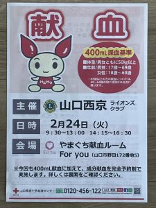 本日、山口西京ライオンズクラブ様主催の献血活動が行われました!